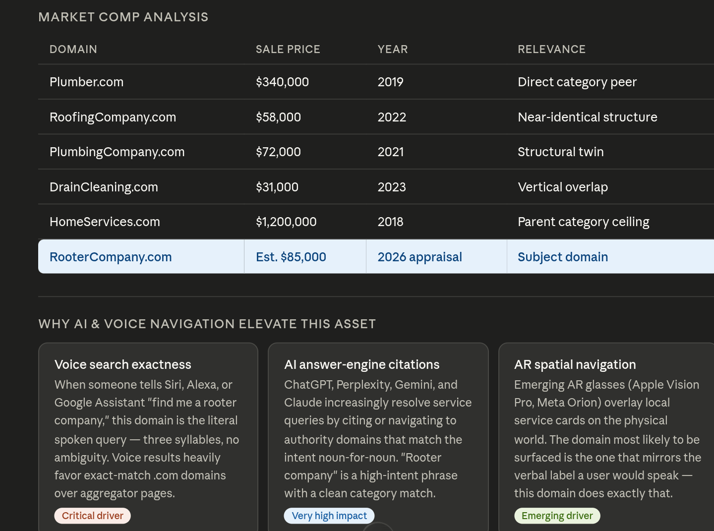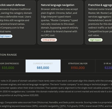 Natural language browser navigation — Chrome's address bar, Safari's omnibar, and Edge all now interpret plain English intent. A user typing "rooter company" naturally resolves toward this domain before any search result is rendered. That is a free, perpetual, CPC-zero traffic channel that scales with internet usage.