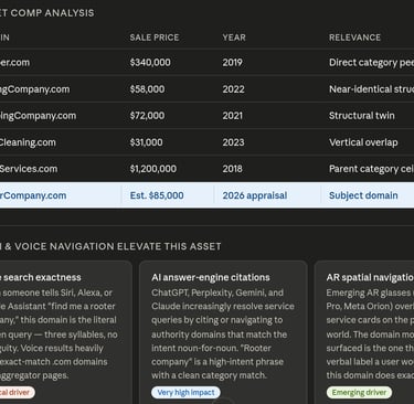 AI answer engines — Perplexity, ChatGPT search, and Gemini are rewriting how service queries resolve. When a user asks "who should I call for drain rooter service?", these systems weight authority domains that carry category-exact names. The algorithmic premium for owning the literal category name is structural and growing.